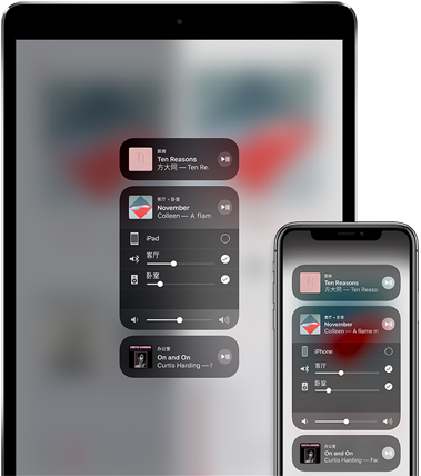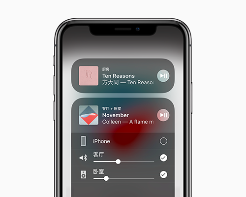 无论是通过控制中心、锁定屏幕,还是 app 内的隔空播放选项,你都可以选择歌曲,并控制隔空播放适配扬声器的音量。