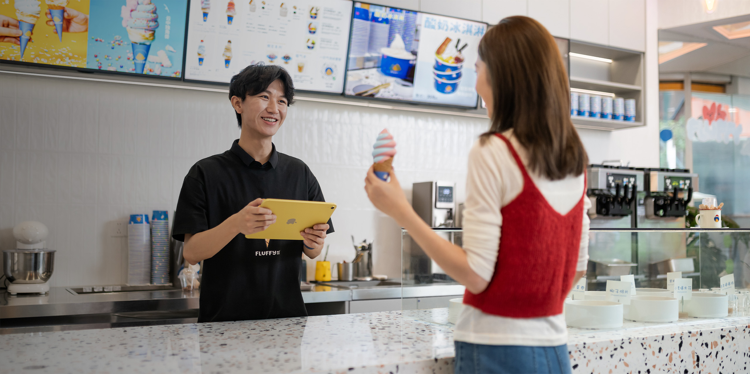 2020 年,三位好友联手创立了 FLUFFY。门店不仅提供冰淇淋、小食和饮料,还满是各种妙趣横生的品牌周边商品。正是对趣味和便利的专注,令他们的业务快速拓展。他们也将公司的发展归功于 Apple 产品的助力,有了 iPad、iPhone 和 Mac,他们能在全上海开快闪店、精简各项流程、尽情发挥创意,并与回头客群体保持紧密联系。