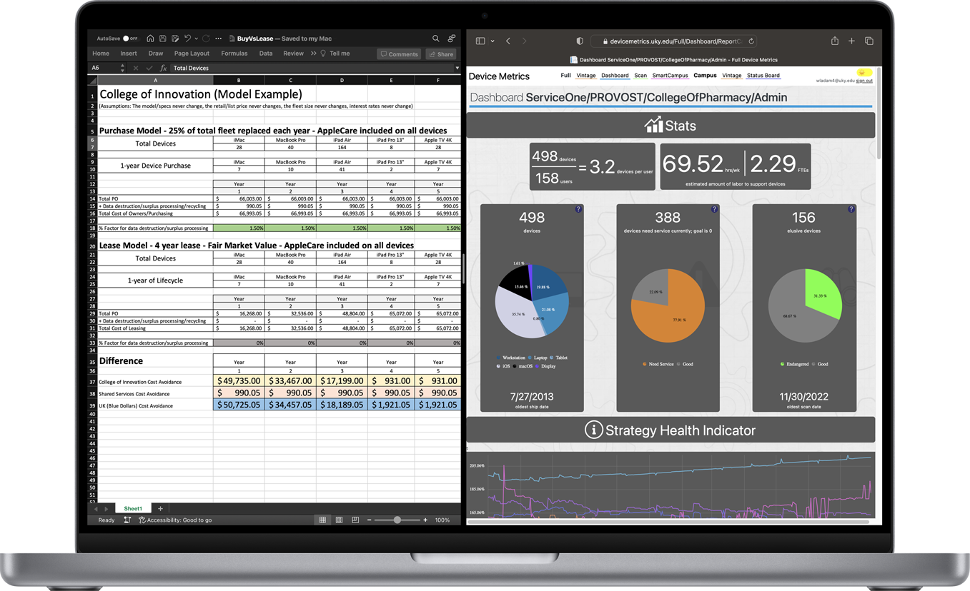 MacBook Pro 性能强大,从数据处理到可视化呈现,都能够为 Adams 的分析提供有力支持。分屏浏览功可以精美地并排展示 Excel 中的数据和肯塔基大学的技术性能表现总界面。
