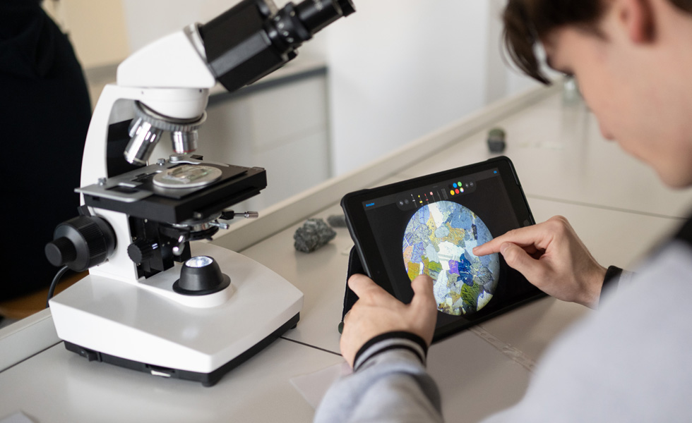 iPad 的内置 app 和丰富功能为学生们带来一流的学习工具,让他们用一台设备就能畅游各个学科领域。在生物教师 Sophie Padilla 的课堂上,学生们使用相机 app 拍摄通过显微镜看到的细胞,然后在 Keynote 讲演中对图像做出标记,为他们的发现添加注释。在 Stéphane Calvo 的物理课上,学生们观察滚动物体的运动,在 Numbers 表格中记录相关数据,并轻松创建可视化图形,以找出结果中的模式。