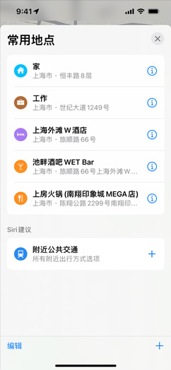 你只需打开地图 app ,轻点屏幕底部的账户头像,即可集中查看自己常用的设置选项,包括首选的交通方式、已报告的问题和常用地点。当你在设备上或配备 CarPlay 车载的汽车仪表盘上打开地图 app,轻点一下,就能查看家、公司、健身房、孩子学校、附近加油站、喜爱的餐厅等常用地址。
