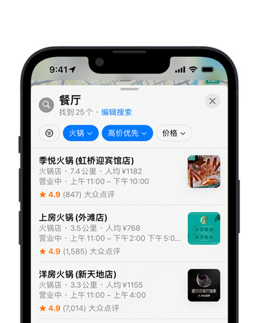 在地图 app 中搜索你所需的信息,既快速又轻松。你可以使用过滤功能,根据菜系风味、价格区间、是否提供外卖等条件,有针对性地搜索餐厅,还可以只查看正在营业的餐厅;想扩大搜索范围的话,只要移动地图,就能自动更新搜索结果;如果想查找离家更近的店,只需轻点“附近”,就可以找到周边的餐厅、加油站、咖啡店、酒店、酒吧、快餐店、杂货店和购物中心等场所。各个地点均以彩色图标的形式显示在地图上,你可以轻轻松松选择中意的那一家。