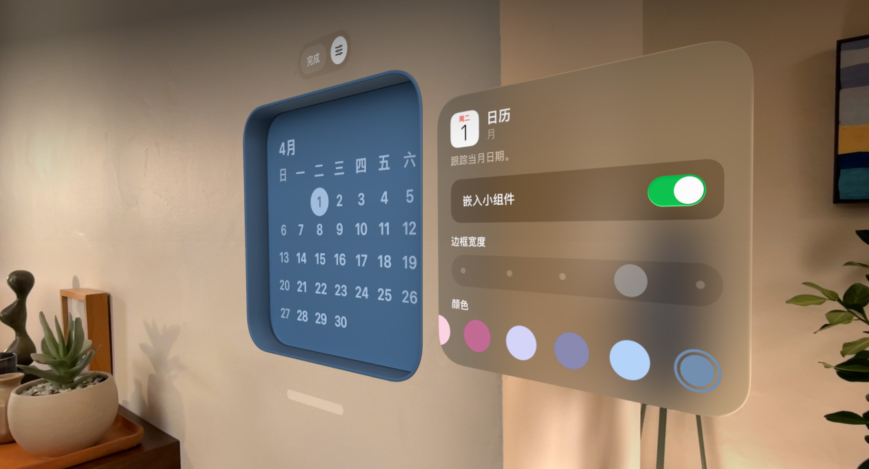 把常用小组件放进你的空间,让照片、时钟、音乐和日历都一目了然。边框粗细、颜色和深度均可自定,具体摆放的位置也由你定。每次戴上 Apple Vision Pro,这个精心布置的空间都会原样展现眼前。
