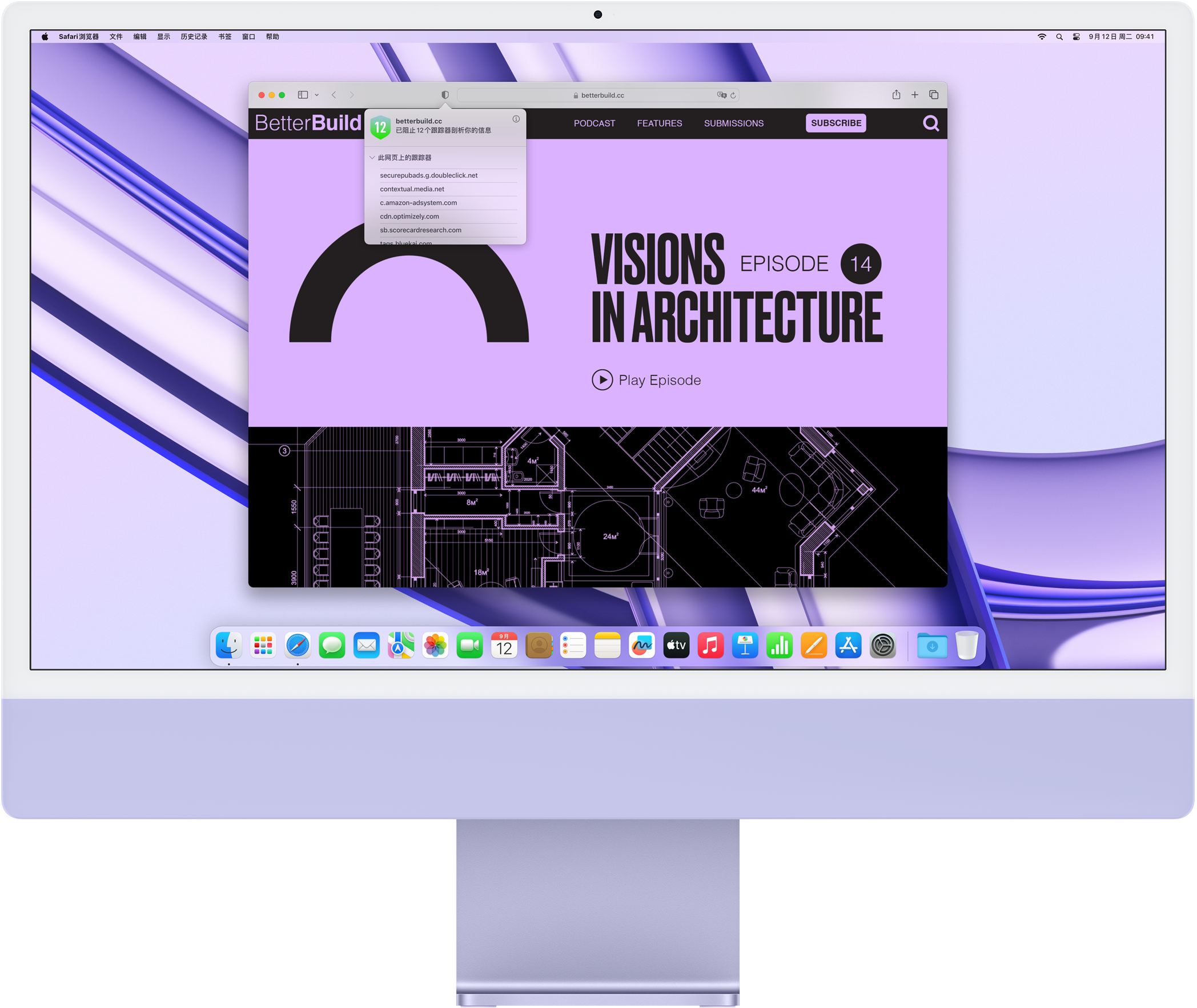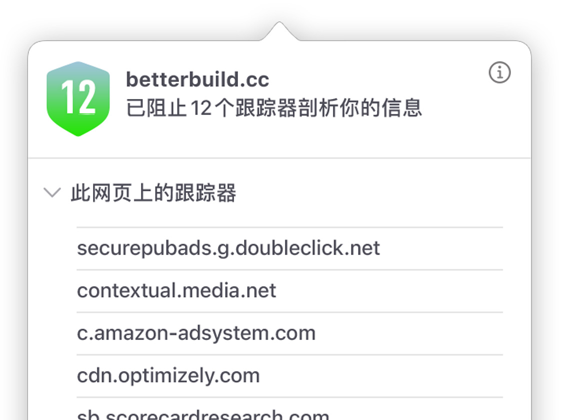 你能轻松地查看 Safari 浏览器是如何在你访问的所有网站上保护隐私信息的。在访问某个网站时,你可以点击“Safari 浏览器”菜单中的“隐私报告”快速查看简报,了解正因企图针对你建立信息档案而被阻止的跨站跟踪器;也可以阅读每周隐私报告,看看 Safari 浏览器是如何在你浏览页面时随时提供保护的。